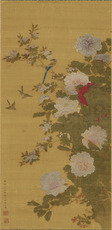 太湖石と紅白の芍薬、花海棠などを描き、山鵲と小禽を配する。その作者は、花弁を隈取る描写や葉の表裏を塗り分ける彩色、奥行きを浅く設定する構図、落款印章などから、琉球の画家・山口宗季(呉師虔、1672-1743)と考えられる。山口宗季は琉球王国首里王府が所管した貝摺奉行所の絵師で、王府の命で福州に留学(1704-07)して中国の花鳥画家・孫億(1638-1712-?)に学んだ。本図は落款の年記から、山口宗季が王府の命により画法習得のため中国・福州(福建省)に滞在していた時期の制作であることが分かる。そのため本図は山口宗季の留学の成果を知るうえで重要であり、福建絵画に学んだ琉球絵画を理解するうえで大きな意義をもつ。