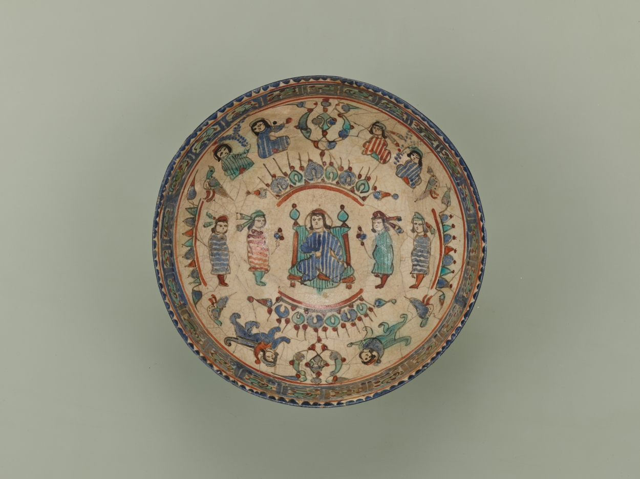 白釉をかけた素地に黒で輪郭をとり、赤、青、ターコイズ色などで彩色した色絵陶器の鉢。見込み中央に玉座に座る人物を主文として据え、左右に2名ずつ従者の姿を描く。その上下には花文を飾り、周囲には楽士のような人物や、鳥文、さらに有翼人面の獣も描かれる。華やかな王庭で楽の音に包まれる王の姿と、その威厳の様相が表現されている。このようなモチーフは、イスラーム世界で書物の装飾的な挿絵として流行した、細密画(ミニアチュール)の影響をうかがわせる。